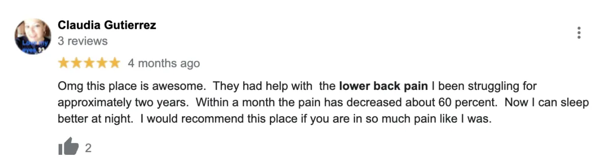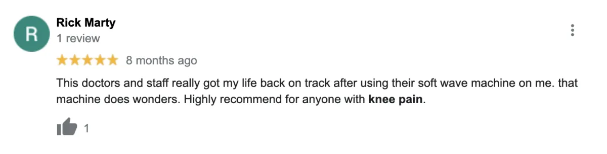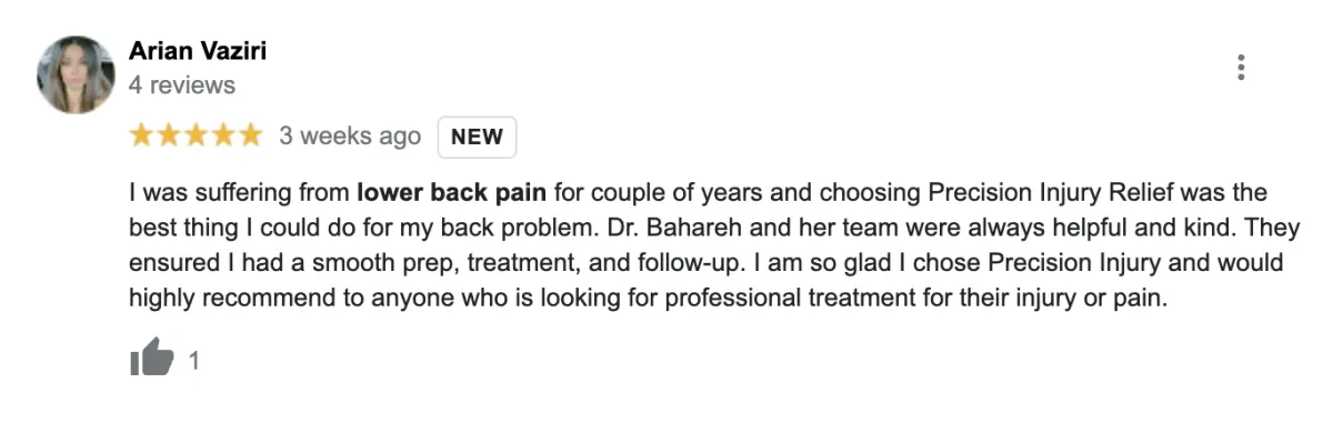 Disclaimer: Procedures and treatments performed by Precision Injury Relief have an inherent success (and failure) rate. Reviews, testimonials and content on this site should not be interpreted as a statement of efficacy of procedures and treatments performed by Precision Injury Relief for anyone else.